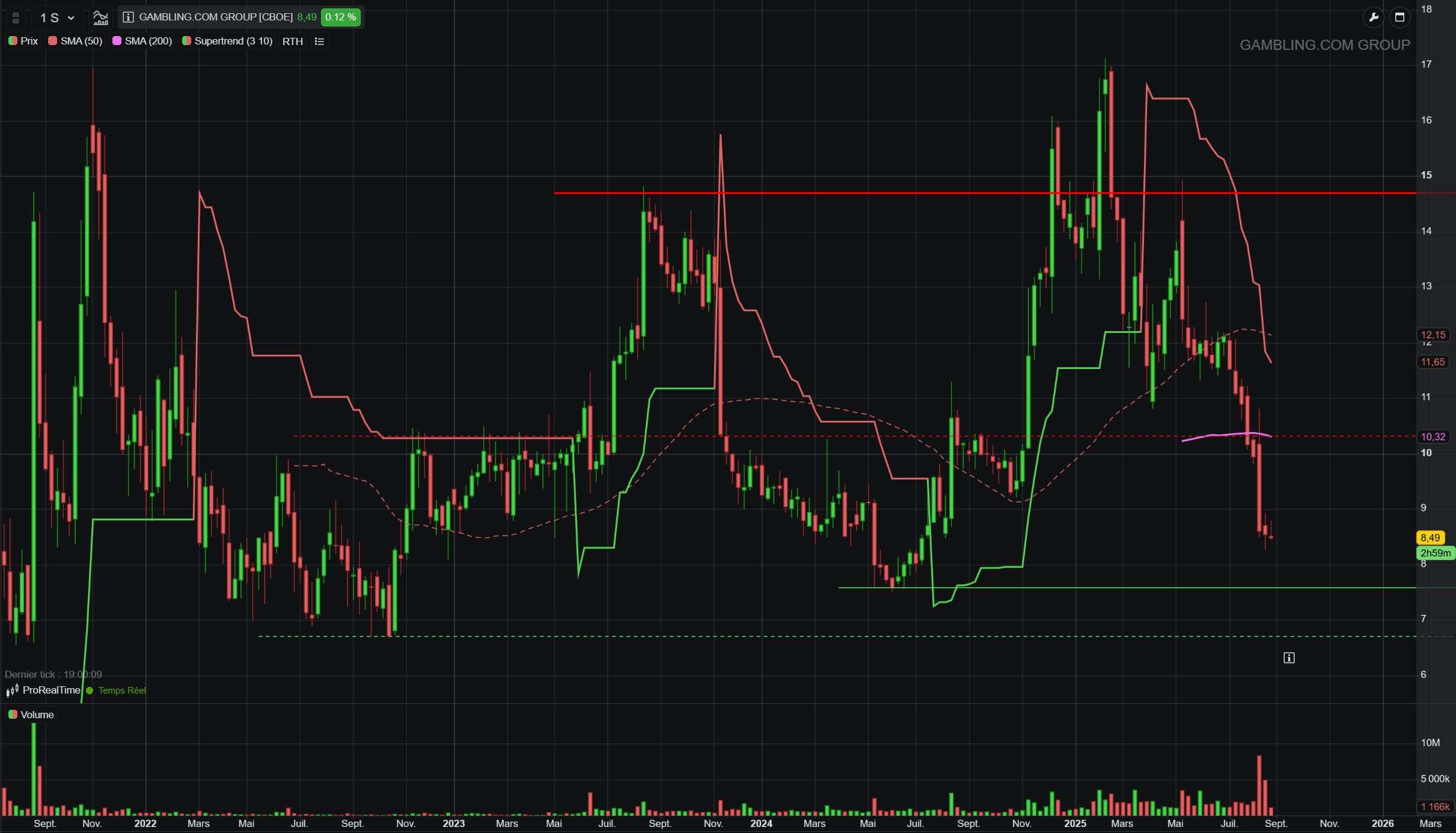 Le momentum sur l'action est clairement négatif depuis le début de l'année 2025. Les plus bas se situent à 6,72 $, et nous observons une augmentation du volume de transactions, malheureusement orientée à la baisse.