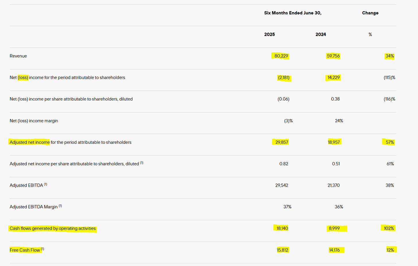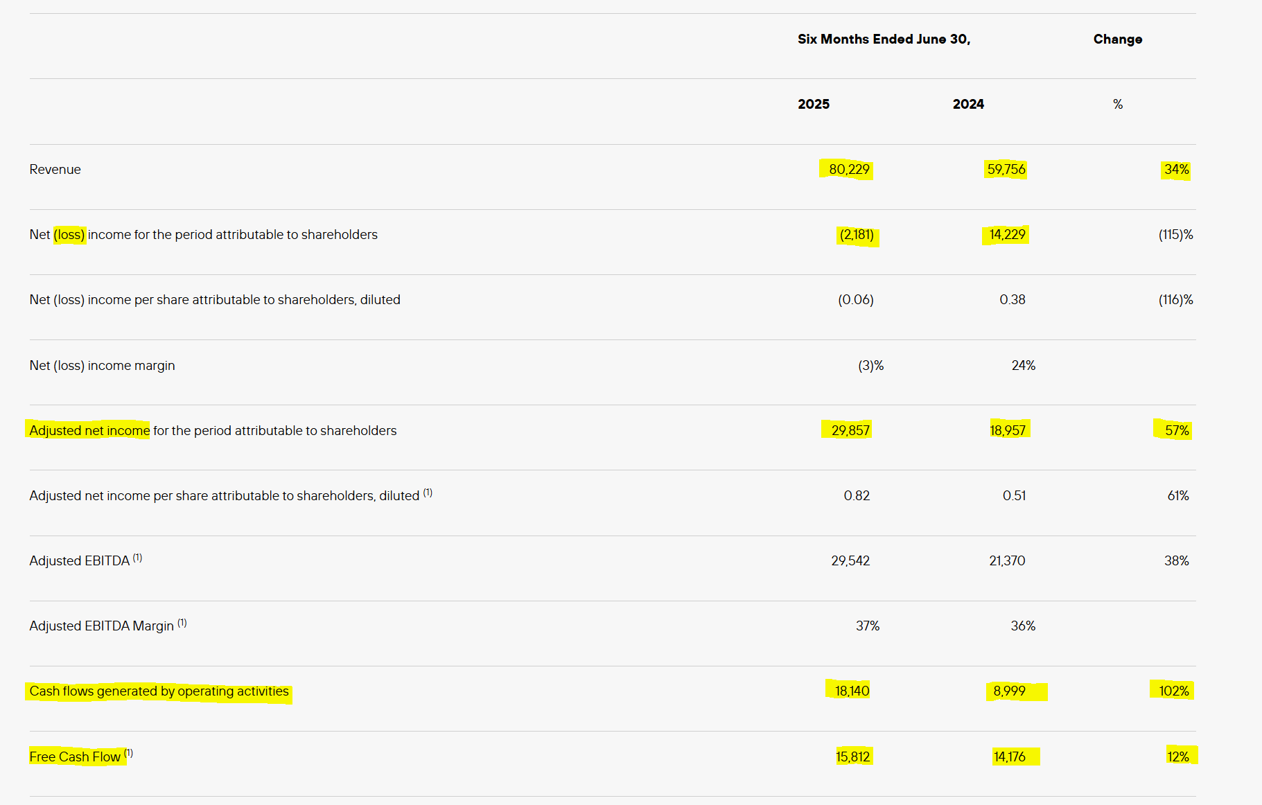 Forte croissance du résultat net, en augmentation de 57% sans les éléments non cash. La marge nette est de 37% contre 31,7% au S1 2024